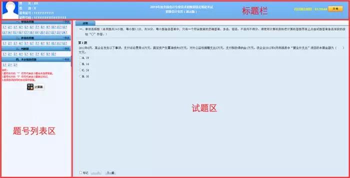 答題界面上方為標(biāo)題欄,左下方為題號(hào)列表區(qū),右下方為試題區(qū)。