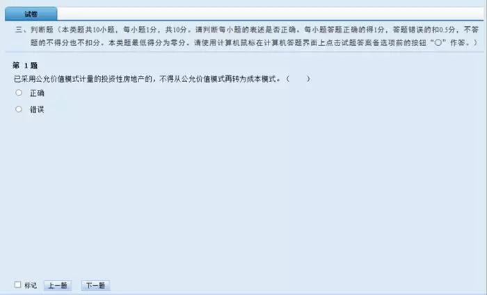 1、根據(jù)考試科目不同,試題類型分為單項(xiàng)選擇題、多項(xiàng)選擇題、判斷題、不定項(xiàng)選擇題。題號(hào)右方的“*”號(hào)表示該小題還未作答,“?”號(hào)表示該小題做過(guò)標(biāo)記。考生可以通過(guò)題號(hào)列表查看本考試科目全套試卷的作答情況(包括每道試題的已答或未答狀態(tài)、標(biāo)記狀態(tài)),還可點(diǎn)擊各題號(hào)按鈕,直接進(jìn)入各試題進(jìn)行答題或檢查。