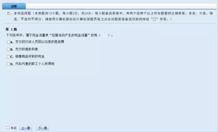 對(duì)試題所作的標(biāo)記,不會(huì)被作為答題結(jié)果,也不會(huì)影響考生的成績(jī)?cè)u(píng)判。考生如合理使用試題標(biāo)記功能,可以在大量的試題中快速查找到需要重點(diǎn)檢查的試題。系統(tǒng)顯示本考試科目剩余時(shí)間,目的是提示考生合理控制答題進(jìn)度。